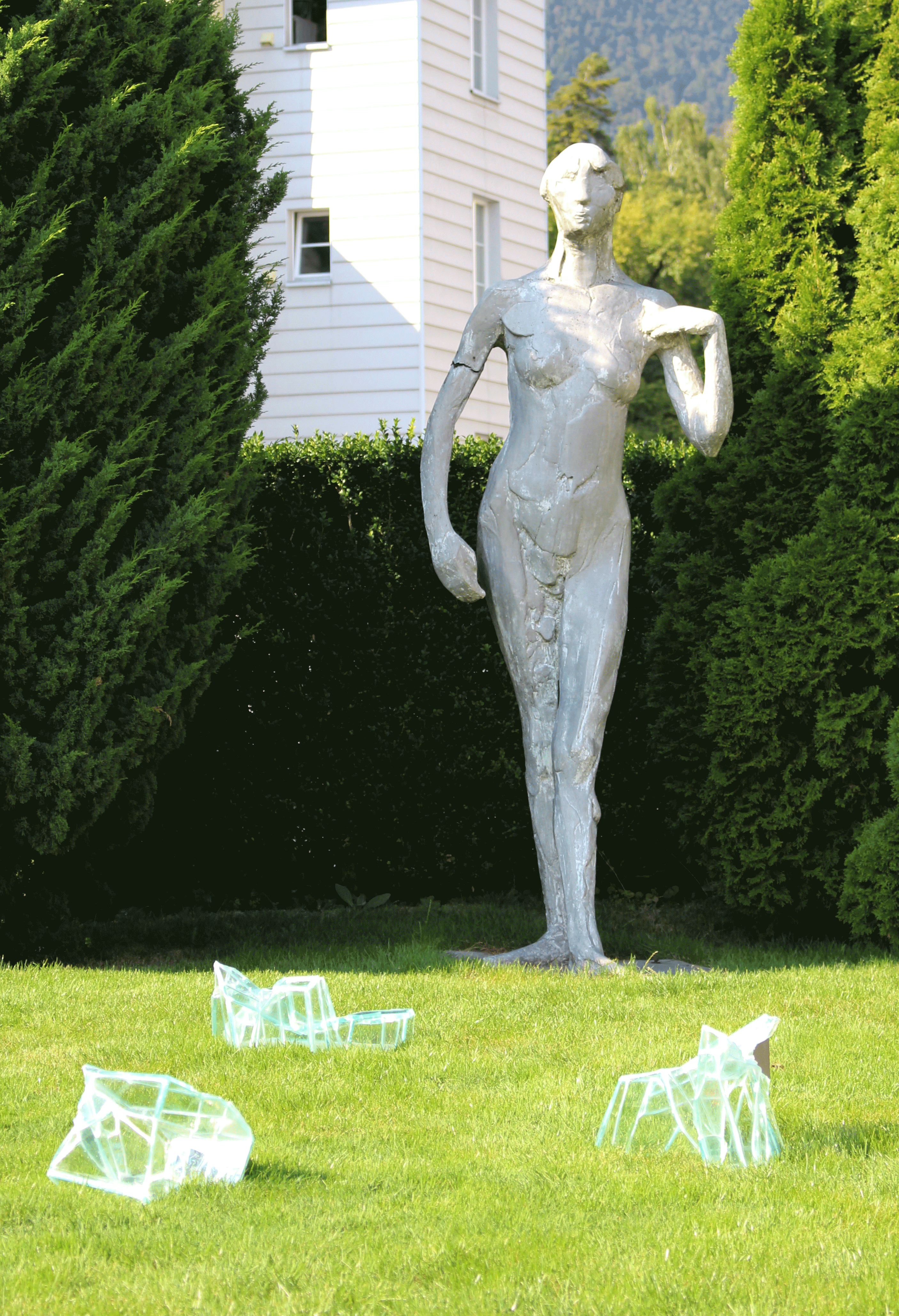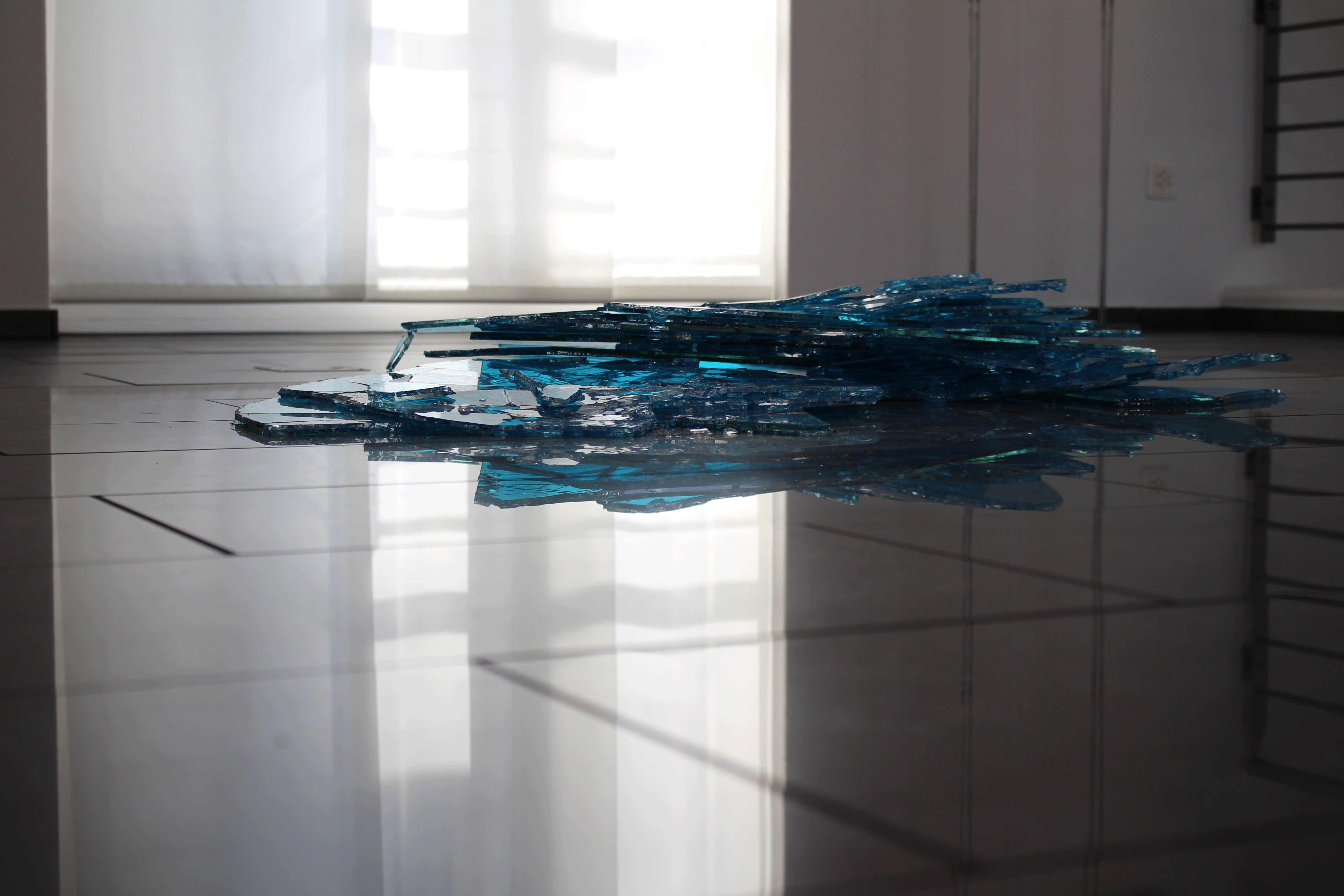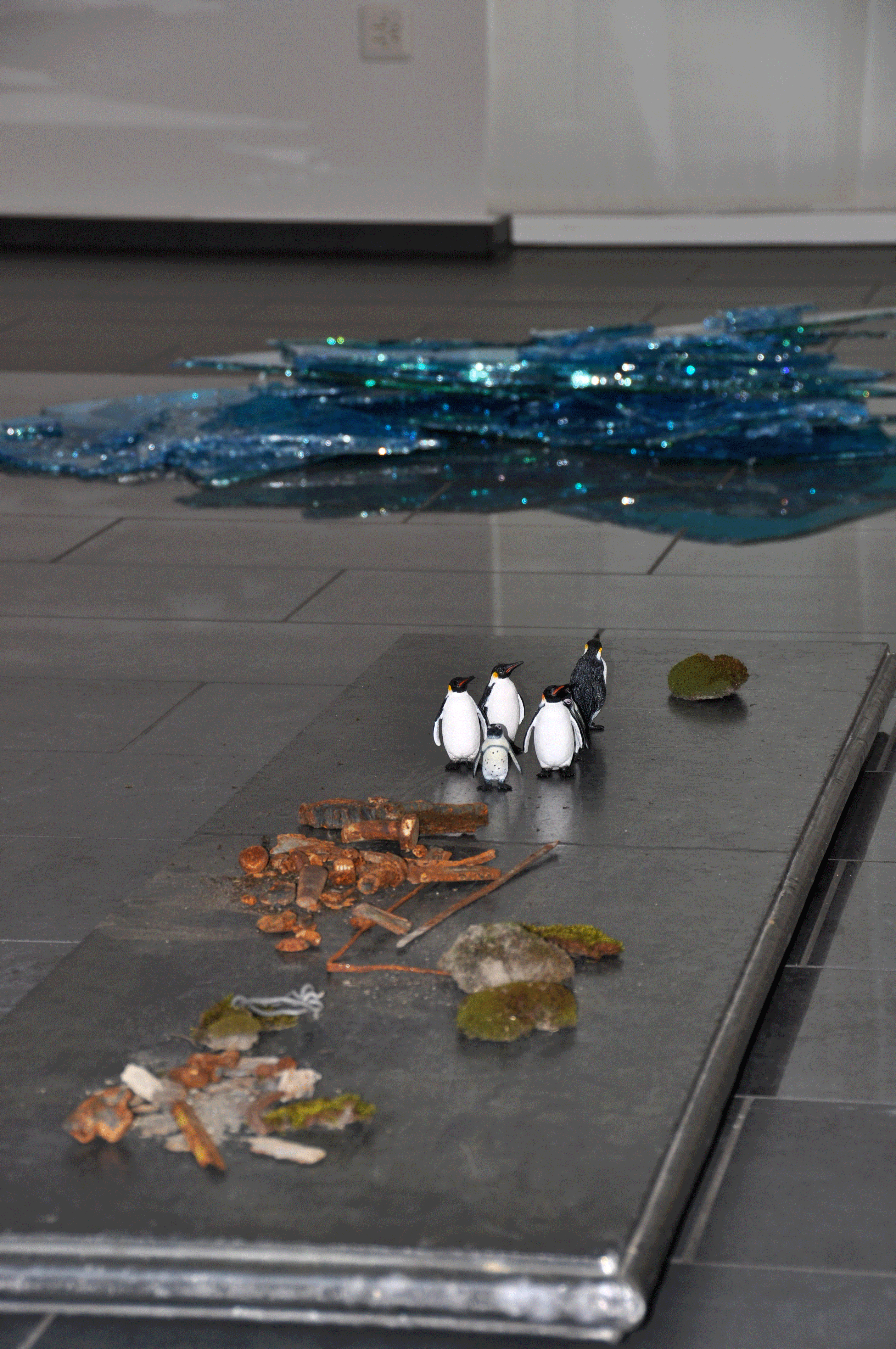 Eisstücke losgelöst erinnert formal an landschaftliche Elemente aus der Gegend Innerschwyz. Die Objekte greifen das Monumentale der Berg- und ehemaligen Gletscherwelt auf und verweisen auf die frühere Eiszeit. In dieser Arbeit lässt sich die Landschaftsgeschichte im Kanton Schwyz als Metapher auf die kulturelle und die damit verbundene gesellschaftliche Situation der Gegend übertragen. Sie thematisiert die Komplexität von politischen oder kulturellen Veränderungsprozessen in Gesellschaften und ruft dazu auf, den Blick nach aussen gleichermassen wie nach innen zu schärfen. Die in Bewegung geratenen Schollen stehen für den Aufbruch an und für sich. Sie sind zur Zeit noch unkoordiniert und ohne klares Ziel unterwegs – ein Zwischenzustand als Wendepunkt. Das Glas nimmt als Material das Fragile von Veränderungsprozessen auf.
