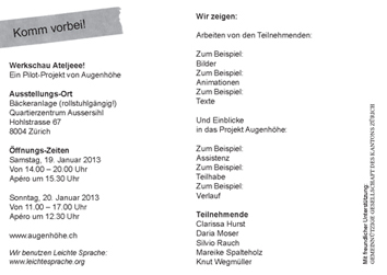 Im Januar 2013 stellte der Verein Augenhöhe im Quartierzentum Aussersihl in Zürich das Pilotprojekt ATELJEEE! vor. Ende 2012 führte der Verein Augenhöhe in Zürich ein erstes Projekt durch. Über den Zeitraum von zwei Monaten konnten Menschen mit und ohne (kognitive) Beeinträchtigung in eienm Gemeinschaftsatelier eigenen künstlerisch-gestalterischen Fragen nachgehen.