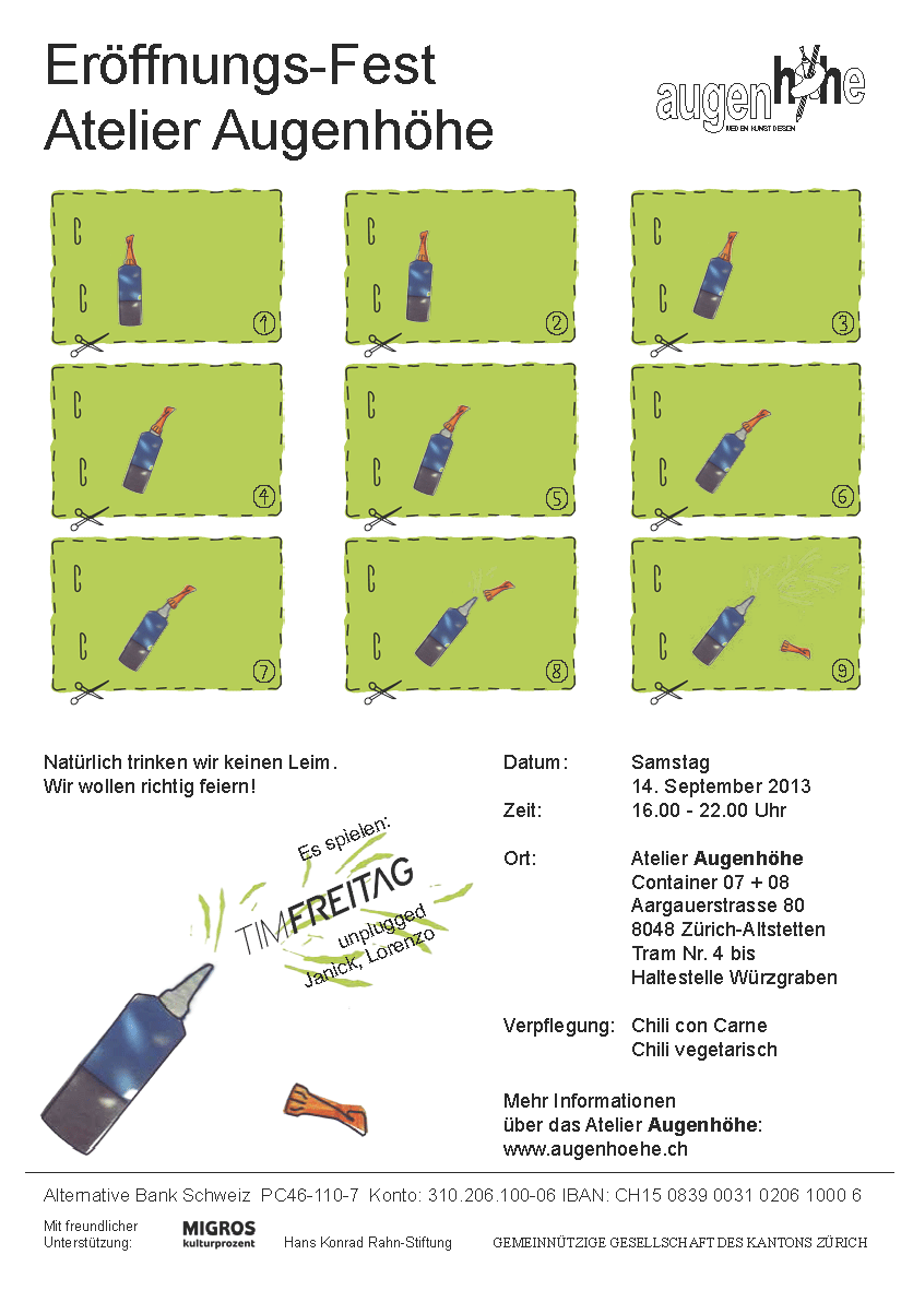 Nach dem erfolgreichen Pilotprojektes Ateljeee! im Herbst 2012 haben wir in den Ateliergebäuden im Basislager in Zürich-Altstetten geeignete, rollstuhlgängige Räumlichkeiten gefunden. Diese weihen wir jetzt ein! Mit Chili Carne / Chili vegetarisch und Tim Freitag unplugged (Janick und Lorenzo).