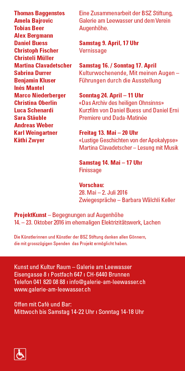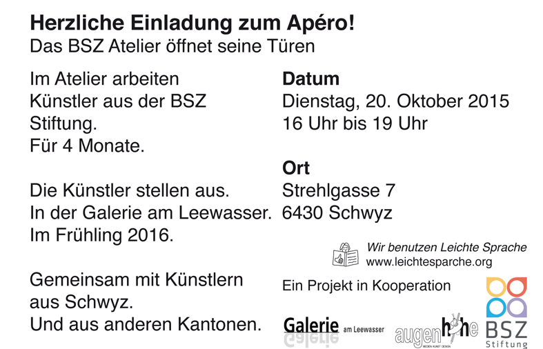 In Zusammenarbeit mit der Galerie am Leewasser und der BSZ Stiftung/SZ stellt der Verein Augenhöhe ein inklusives Kunstprojekt auf die Beine. Im Frühling 2016 findet in der Galerie am Leewasser in Brunnen SZ eine Ausstellung statt, an welcher sich Künstler/-innen mit und ohne Beeinträchtigung beteiligen werden.