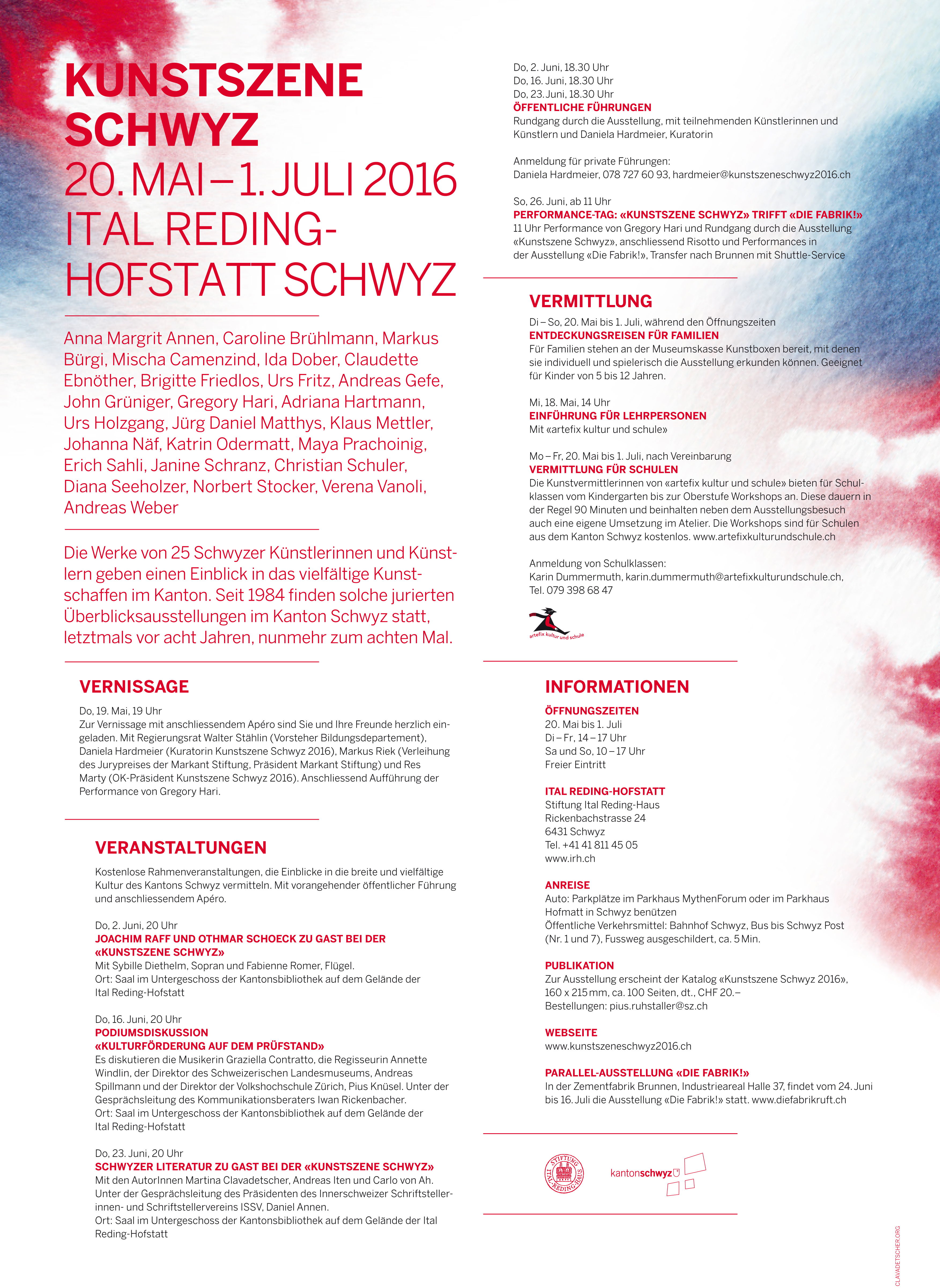 Ab Sonntag, 28. Juli bis Sonntag, 1. September 2013 findet parallel dazu eine Ausstellung aller Teilnehmer/-innen in der Galerie Leewasser in Brunnen statt.